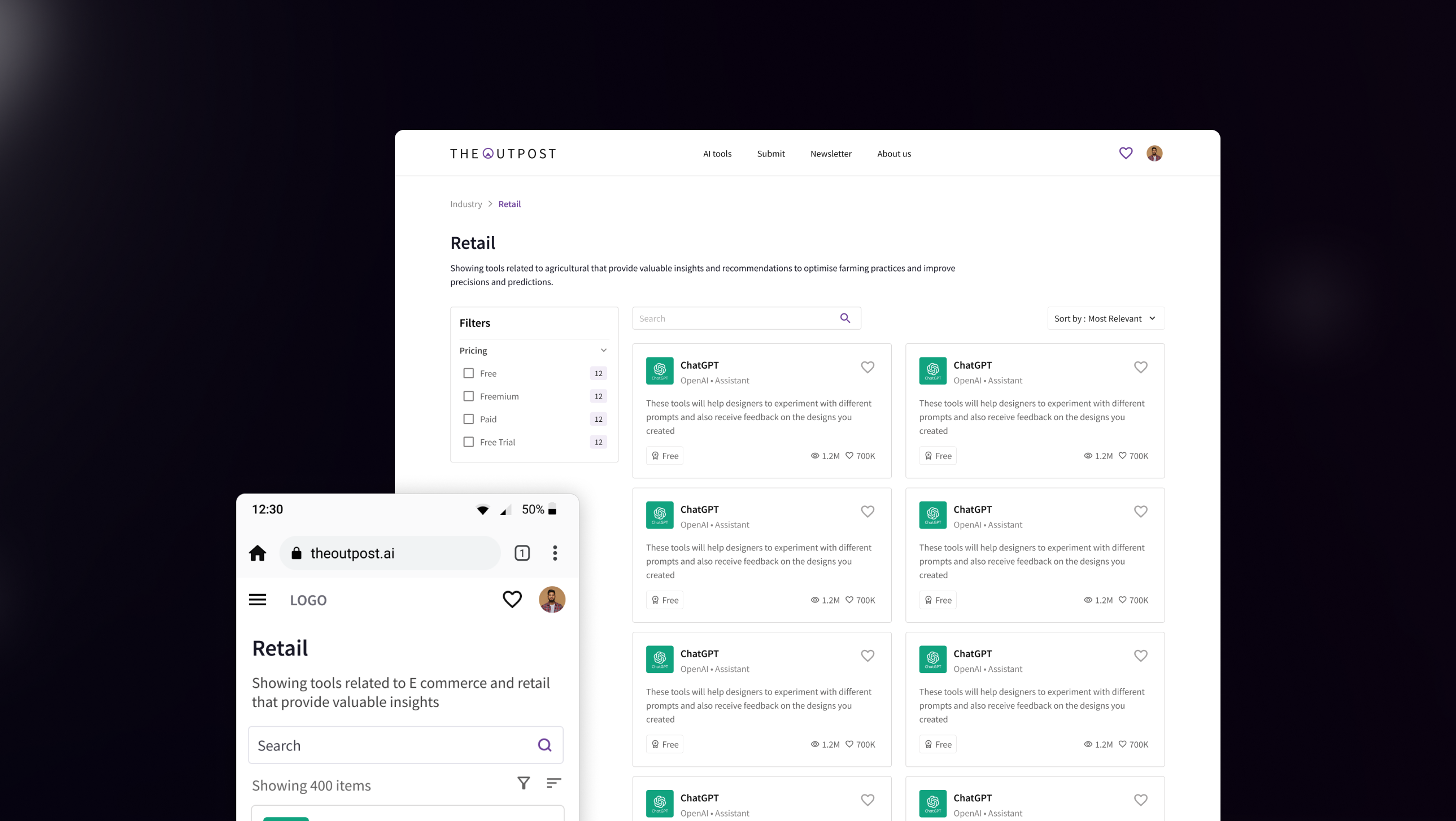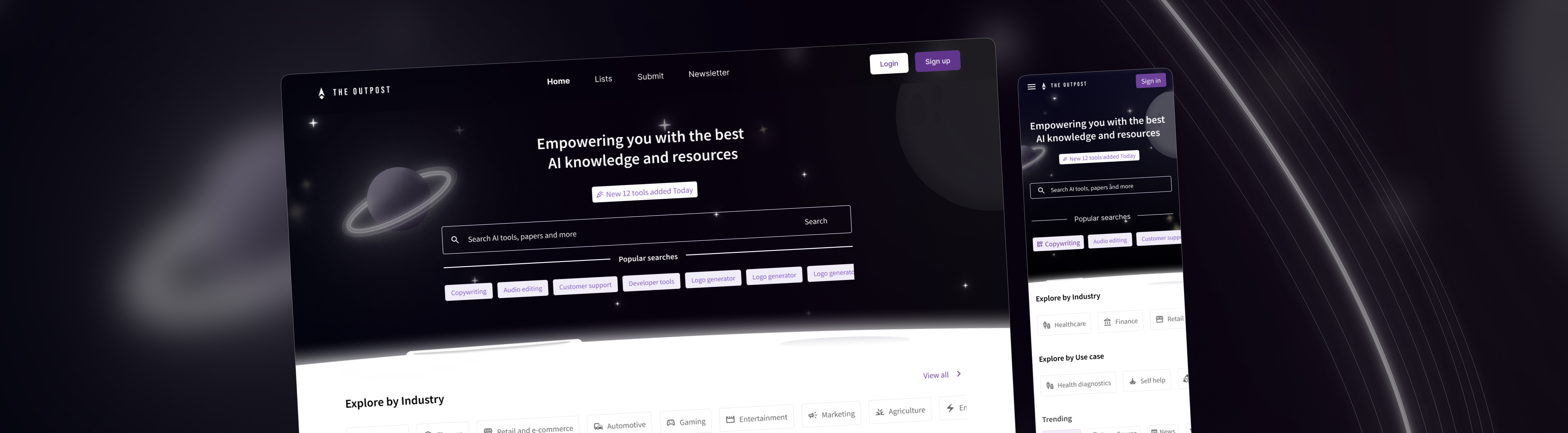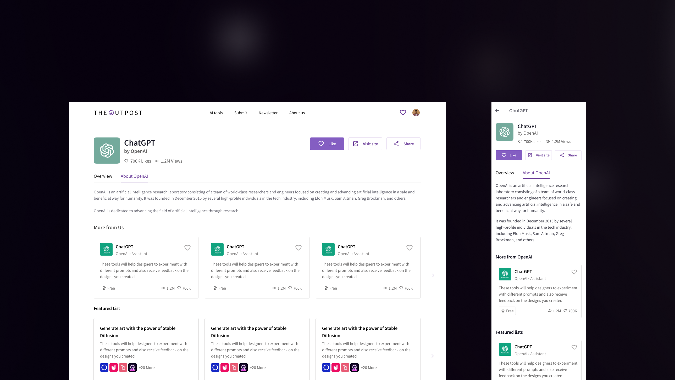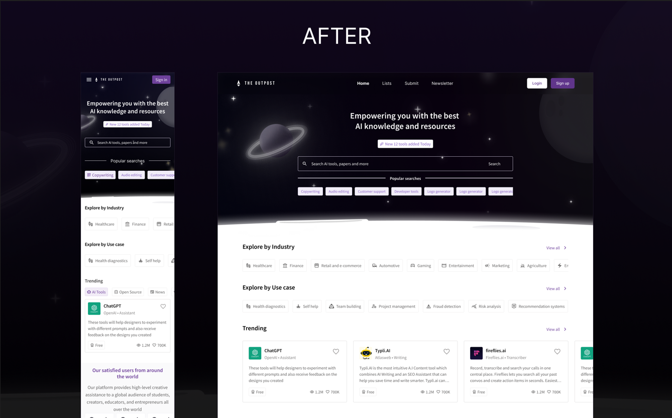 An AI tools directory built for the modern internet. I was handed a generic blue product with no identity — and delivered a complete brand system, dark cinematic UI, and design language from scratch across web and mobile.