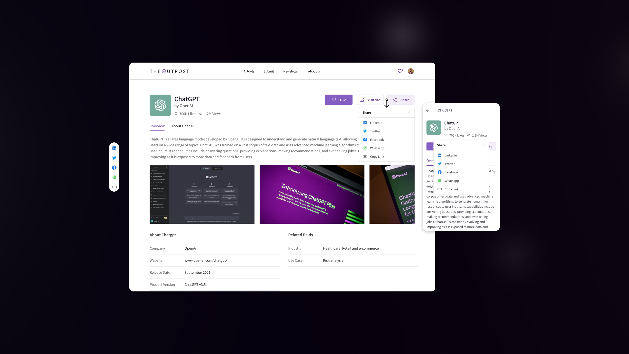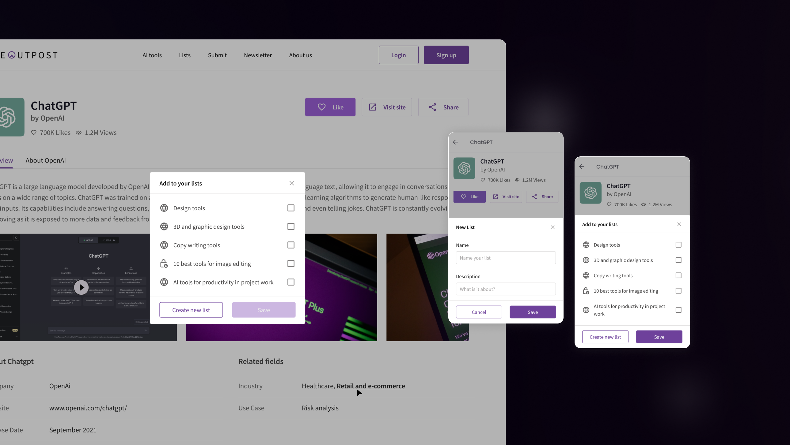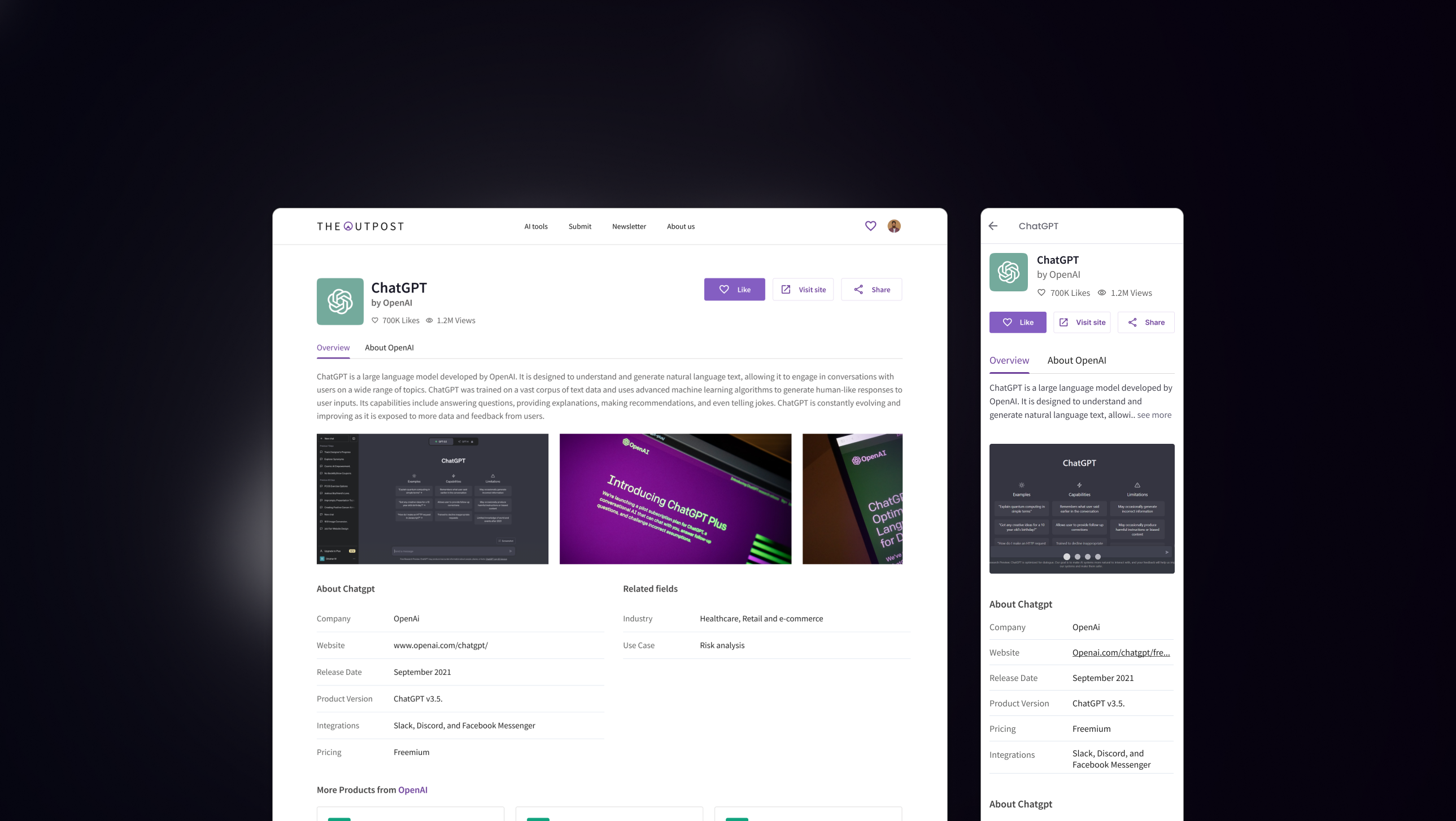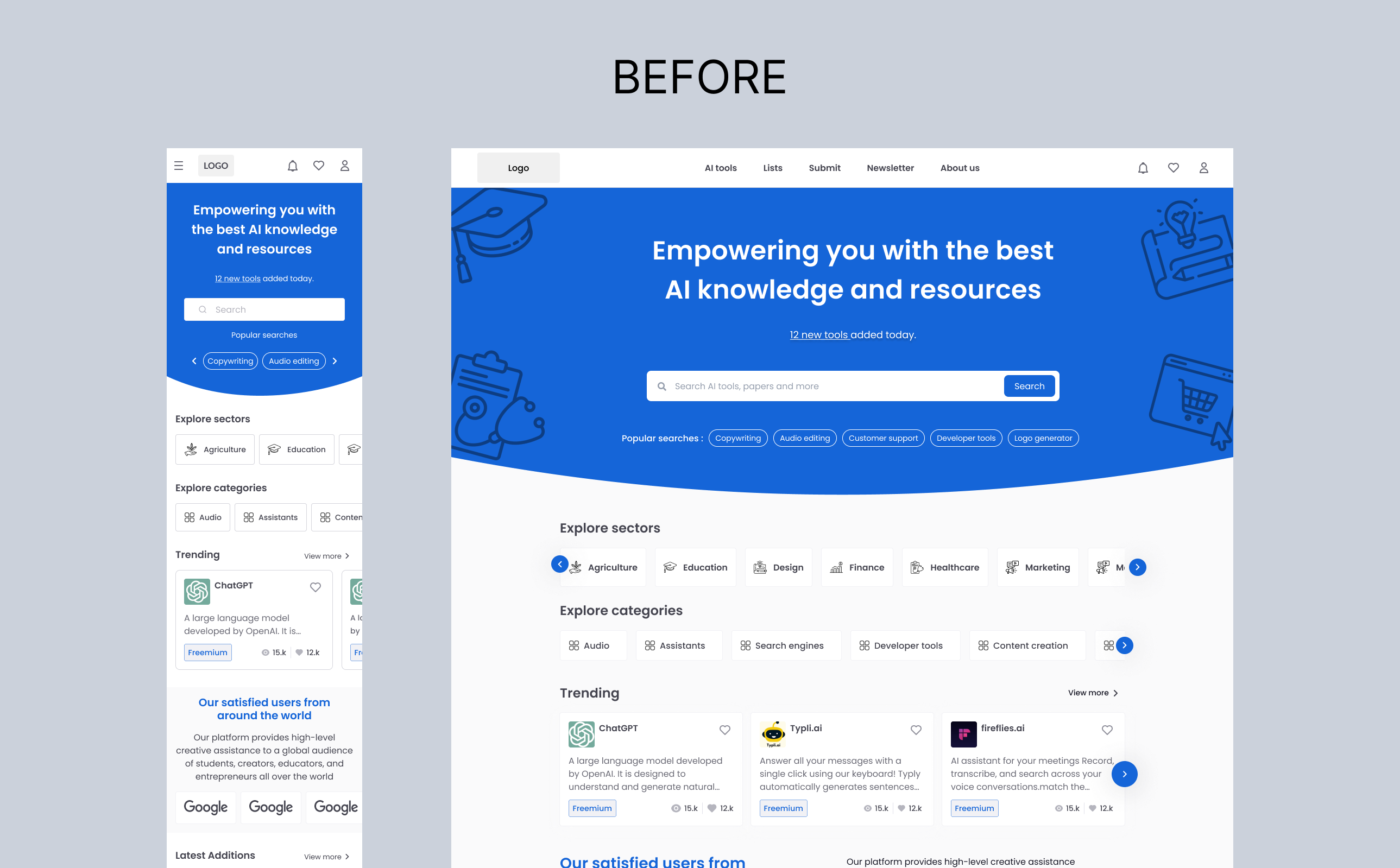 An AI tools directory built for the modern internet. I was handed a generic blue product with no identity — and delivered a complete brand system, dark cinematic UI, and design language from scratch across web and mobile.